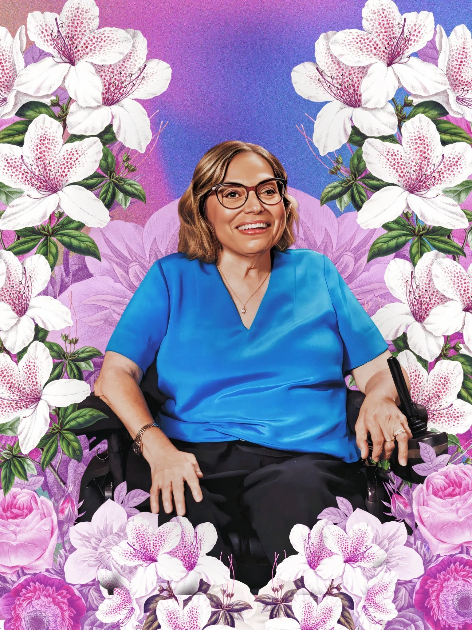 Digital collage portrait of Judy Heumann, a white woman with shoulder-length light brown hair wearing dark red glasses, a blue v-neck shirt, and a gold necklace. She is smiling warmly. Cascading white, pink flowers flow behind her on a purple background.